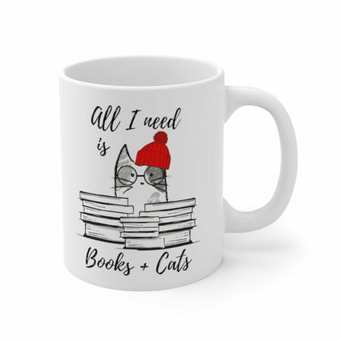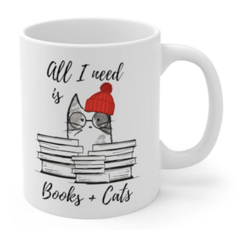 Book Lovers Mug, All I Need is Books & Cats Mug. It’s microwave & dishwasher-safe and made of white, durable ceramic in an 11-ounce size. The perfect gift for the coffee, tea, chocolate and book lovers.